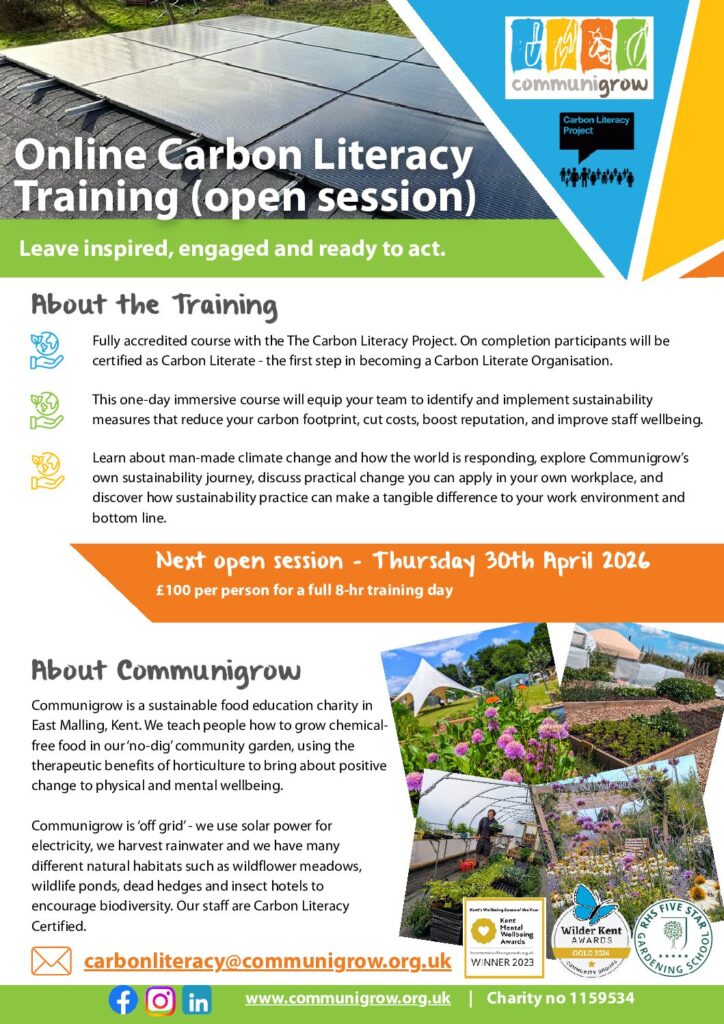 A full day of Carbon Literacy Training at our sustainable food education charity and community garden. Spend the morning training in the Communigrow Yurt and exploring our low carbon site in East Malling, then enjoy lunch and your afternoon session in the neighbouring Mumford Conference Centre at NIAB. This is an ‘open’ session welcoming learners from multiple organisations.