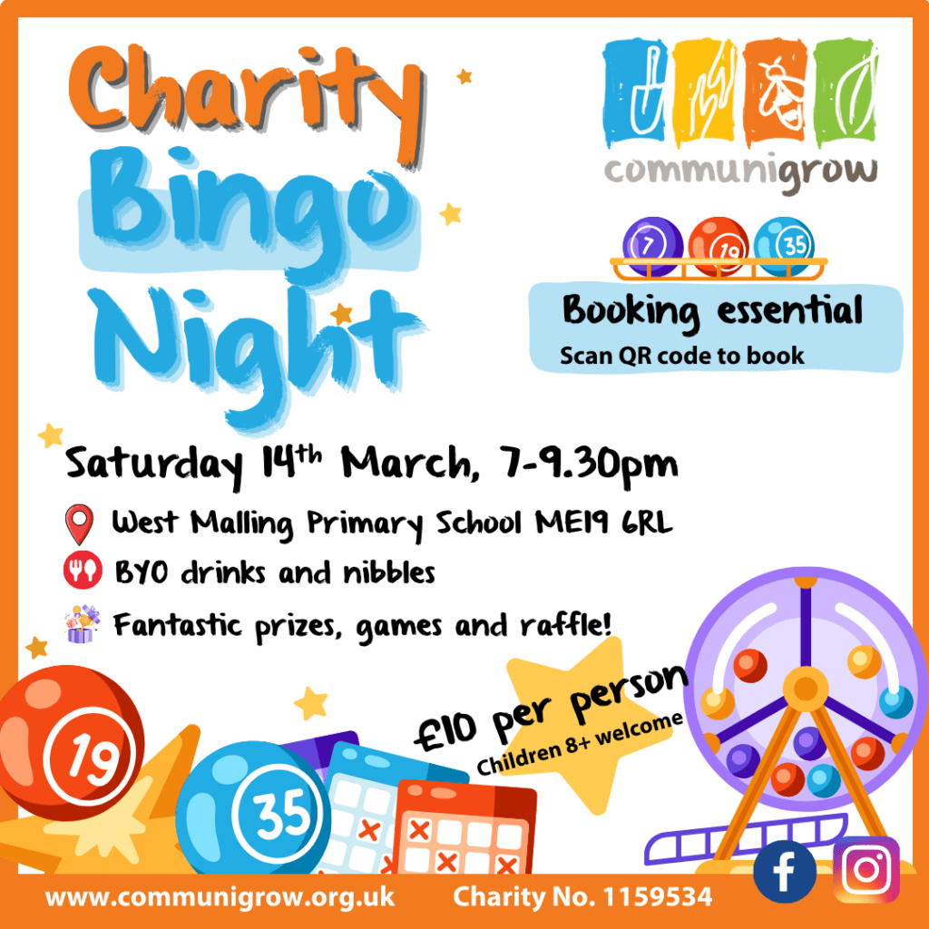 Eyes down for a fun-packed charity Bingo Night in aid of Communigrow on Saturday 14th March 7-9.30pm at West Malling Primary School.